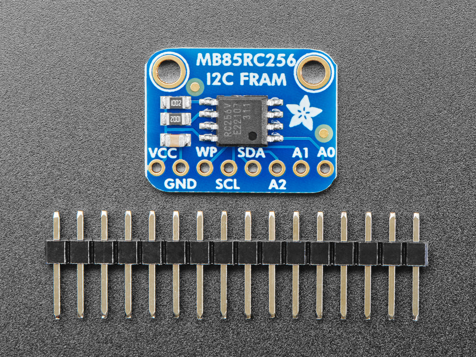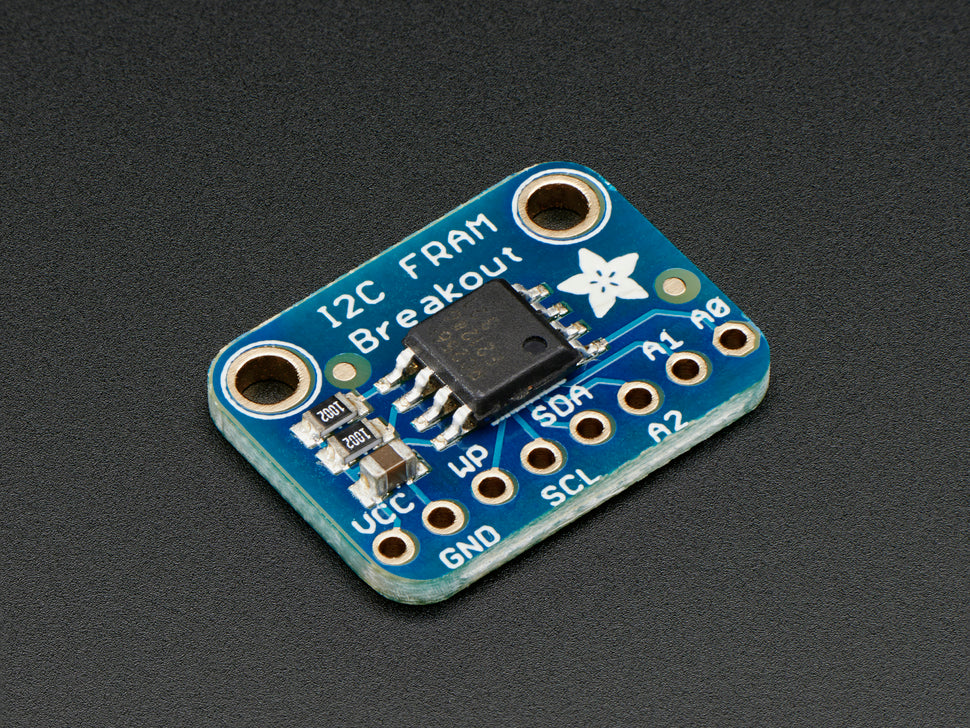 Now, with our I2C FRAM breakout board you can add some FRAM storage to your next DIY project. FRAM allows for a lower power usage and a faster write performance. It's excellent for low-power or inconsistent-power datalogging or data buffering where you want to stream data fast while also keeping the data when there's no power. Unlike Flash or EEPROM there's no pages to worry about. Each byte can be read/written 10,000,000,000,000 times so you don't have to worry too much about wear leveling.