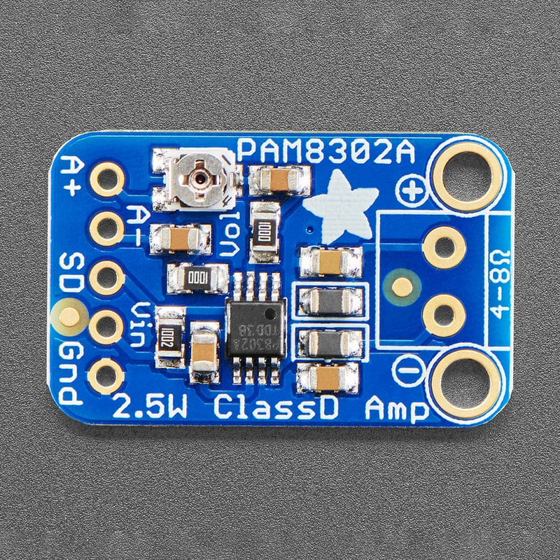 This compact mono amplifier is a powerful solution, capable of delivering up to 2.5 Watts to 4-8 ohm impedance speakers. Featuring a Class D controller, it operates efficiently from 2.0V-5.5VDC and boasts an efficiency of over 90% when driving an 8Ω speaker, making it ideal for portable, battery-powered projects. It includes built-in thermal and over-current protection, ensuring safe operation, while remaining cool even under load. A volume trim pot on the board lets you adjust the volume from the default 24dB gain.