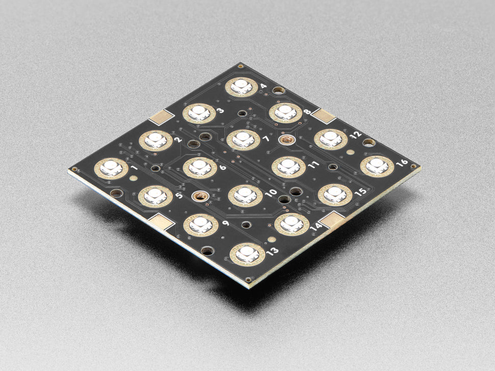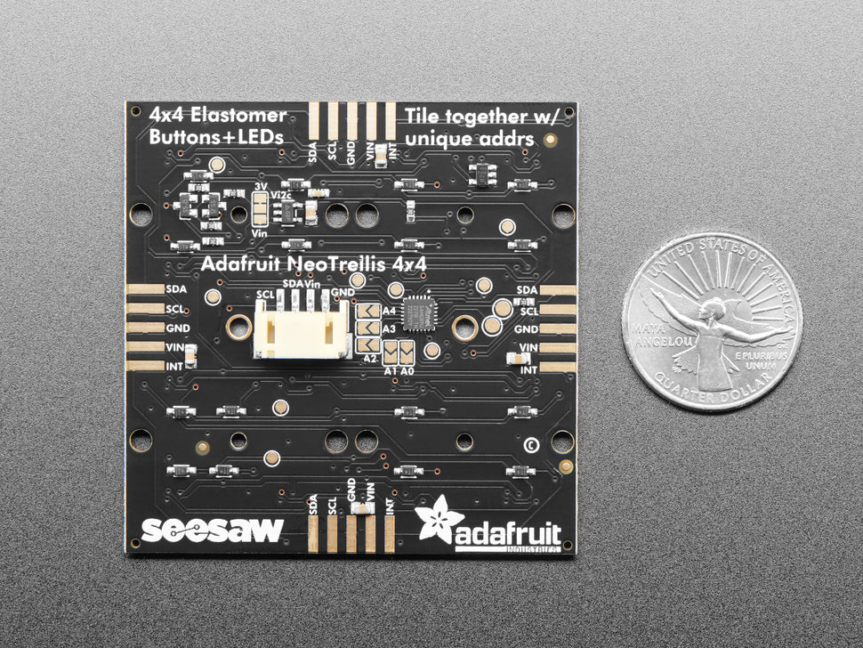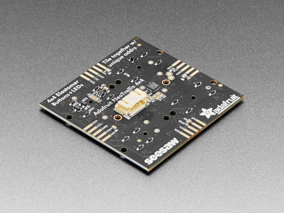 These 4x4 button pad boards are fully tile-able and communicate over I2C. With 5 address pins, you've got the ability to connect up to 32 together in any arrangement you like. With our trusty seesaw I2C-to-anything chip, you don't even need to manage the NeoPixel driving. That's right! Both the button management and LED driving is completely handled for you all over plain I2C. With both Arduino/C++ and CircuitPython/Python library support, you can use these pads with any and all microcontroller or computer boards.