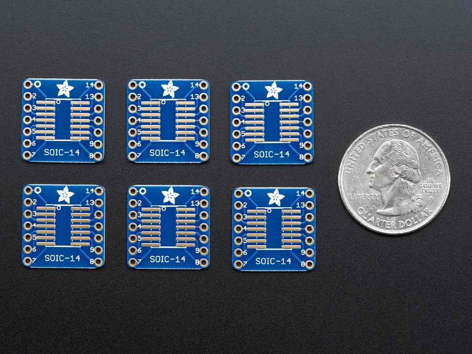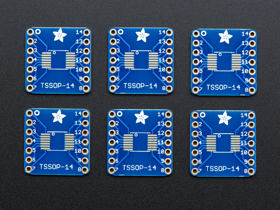 Beguiled by a fancy new chip that is only available in a SOIC or (T)SSOP pinout? This breakout PCB set will make your life much much easier and get you prototyping faster than ever. One side has a 14-TSSOP pin out with traces going to two rows of 0.1" spaced holes, the other has 14-SOIC. Solder your chip to either side and you're ready to rock on any solderless breadboard.
