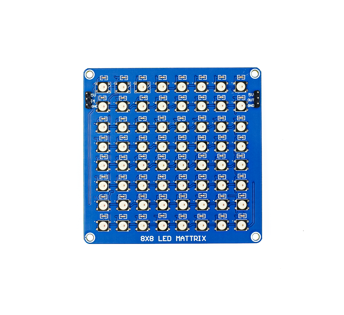 The WS2812B LED, which is used in the 8x8 LED matrix board, is an intelligent control LED light source that control circuit and RGB chip are both built into a package of 5050 components. Its inner components include a signal-reshaping amplifier driving circuit and an intelligent digital port data latch. Include a precise internal oscillator and a 12V voltage programmable constant-current control component to further guarantee the consistency of the pixel point light color height.