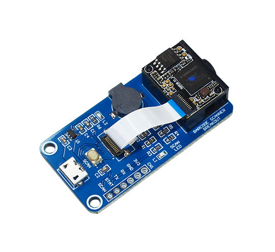 Barcode Breakout is a sturdy and tiny barcode scanner board, with a DE2120 scanner module, buzzer, and a micro-USB port. It is intended to scan and decode 20 different barcode symbologies (both 1D and 2D) using an onboard camera and image processing to detect and decode everything from UPC codes to QR codes. The module also has two LEDs – Power LED and Scan LED.
