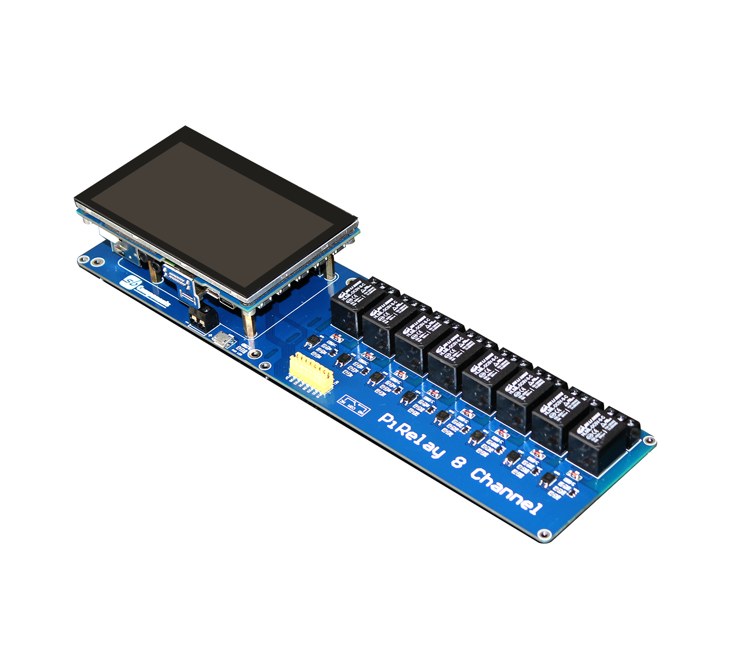 The PiRelay 8 has enough space for the 4.3" LCD to fit comfortably, allowing the user to operate the device with ease. One of the best features on the PiRelay 8 board is the 5 V/2A USB power port. The Raspberry Pi receives power directly from the PiRelay 8 board.