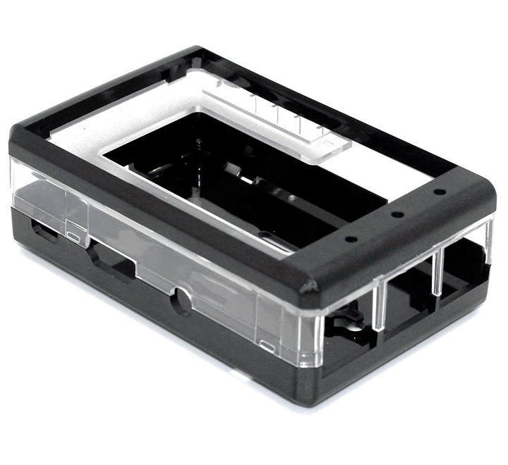 • The case is a three-piece injection-molded ABS enclosure that snaps together around the Raspberry Pi. Holds the board firmly in place.