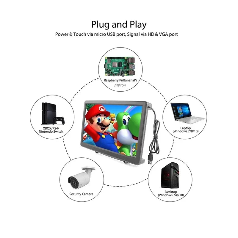 It can work with most devices with HDMI-compatible or VGA ports, compatible with Win 7 8 10 PC, Raspberry Pi, industrial equipment, and medical equipment.
