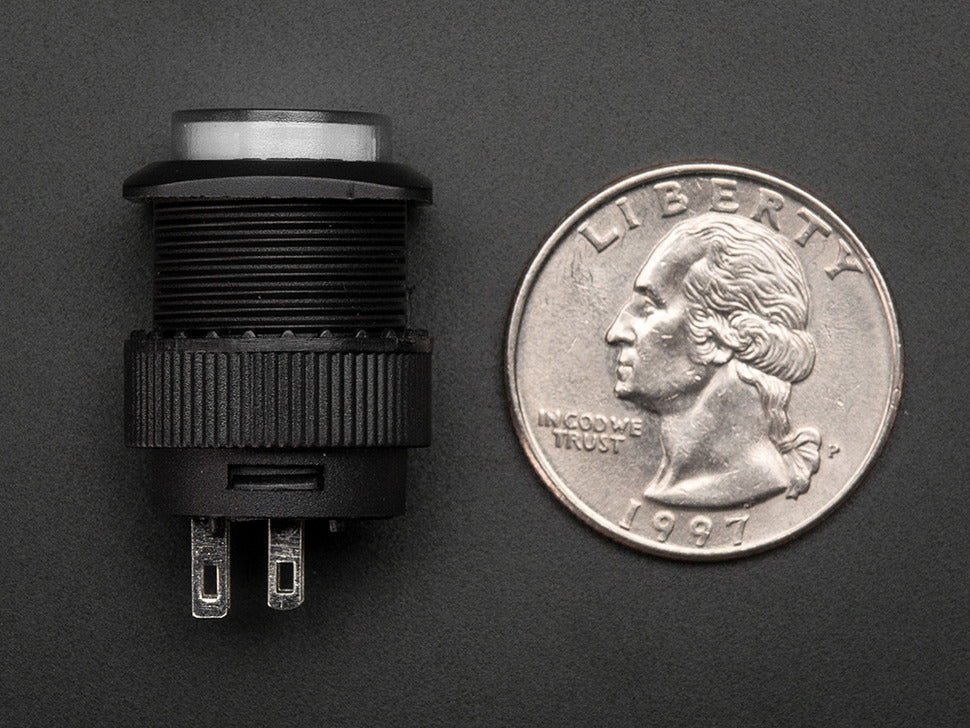 The 16mm Illuminated Pushbutton - White Momentary is a versatile and stylish button featuring a built-in LED that can be controlled independently of the switch. Its medium size makes it easy to press without overpowering your project panel. The button body is black plastic with a white LED inside.