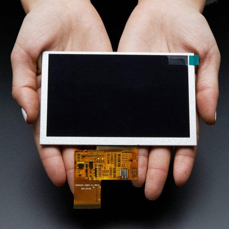 This 5.0" TFT screen has lots of pixels, 800 x 480 to be exact, and an LED backlight. It's great for when you need a lot of space for graphics. These screens are commonly seen in consumer electronics, such as miniature TVs, GPSs, handheld games car displays, etc. A 40-pin connector has 8 red, 8 green, and 8 blue parallel pins, for 24-bit colour capability.