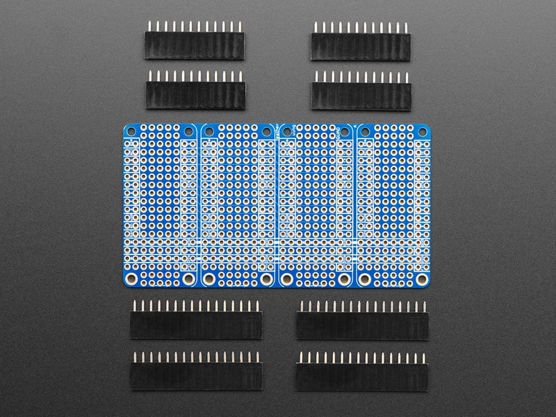 The Quad, like the Proto, has three breakouts for each pin on a Feather, as well as a bunch of plain grid proto holes. Also, the four sets of pins are cross connected and for GND and 3.3V, we give you a full strip of connected pads.
