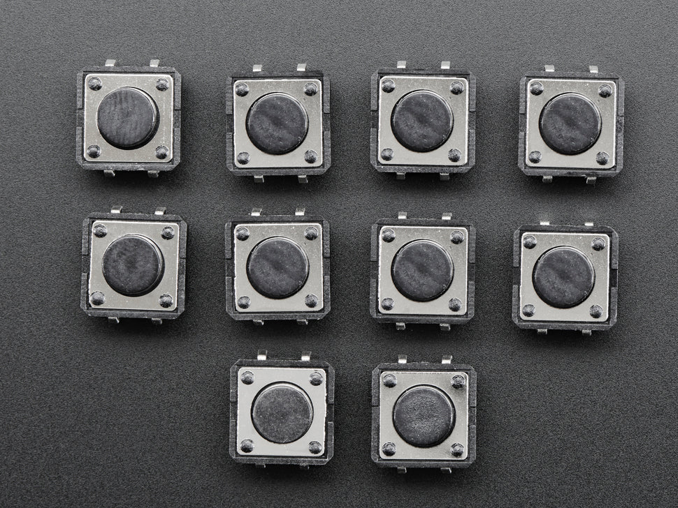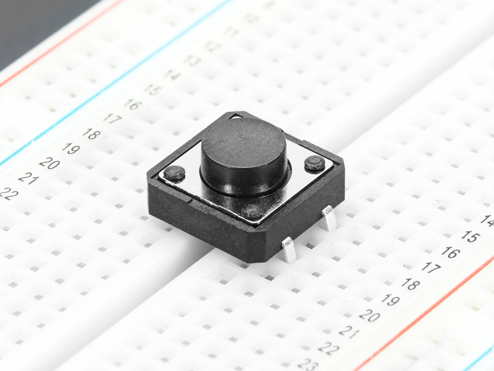 Medium-sized clicky momentary tactile switches are standard input buttons for electronic projects. These switches work best when soldered onto a PCB but can also be used on a solderless breadboard.