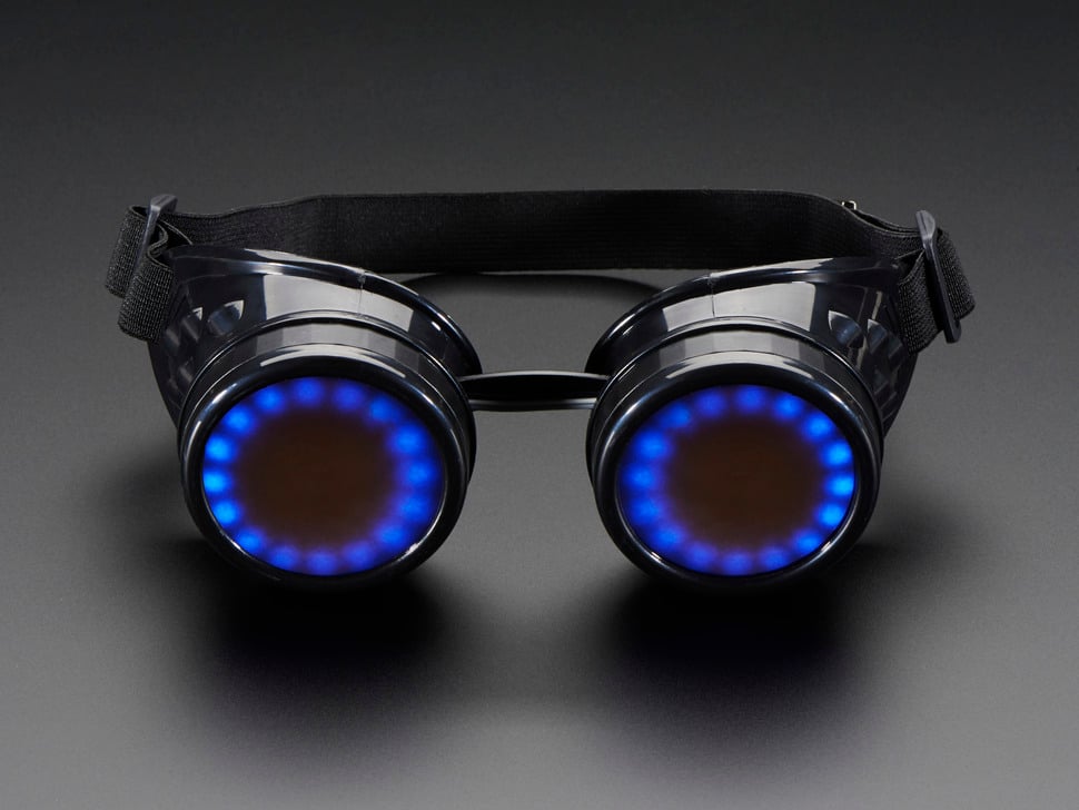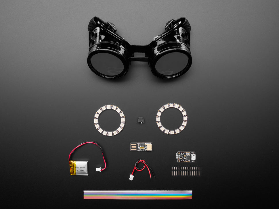 The goggles come with dark-tinted lenses, a rechargeable 3.7V 150mAh Lithium Ion Polymer battery, and a USB LiIon/LiPoly charger. The 16-LED NeoPixel rings fit perfectly inside the included 50mm costume goggles, allowing for bright, vibrant light displays that can be programmed in both Arduino and CircuitPython.