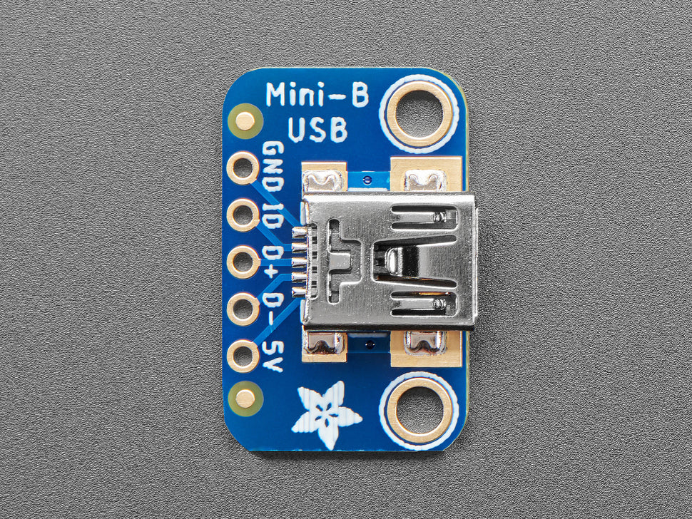 Simple but effective, this breakout board features a USB Mini-B connector with all 5 pins broken out. Perfect for pairing with microcontrollers with USB support or adding USB 5V power to your project.